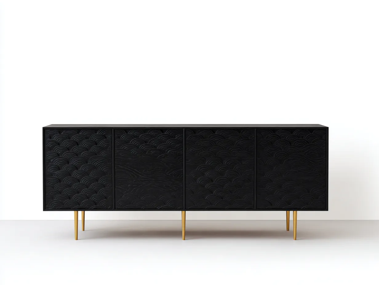 Der Schrank besteht aus Holz und Metall. Die Oberfläche in Schwarz hebt die dekorative Struktur hervor und sorgt für eine gleichmäßige, elegante Optik. Schlanke Metallfüße in Gold bieten stabilen Halt und bilden einen stilvollen Kontrast zum dunklen Korpus. Die sorgfältige Verarbeitung unterstützt eine langlebige Nutzung im täglichen Wohnbereich.