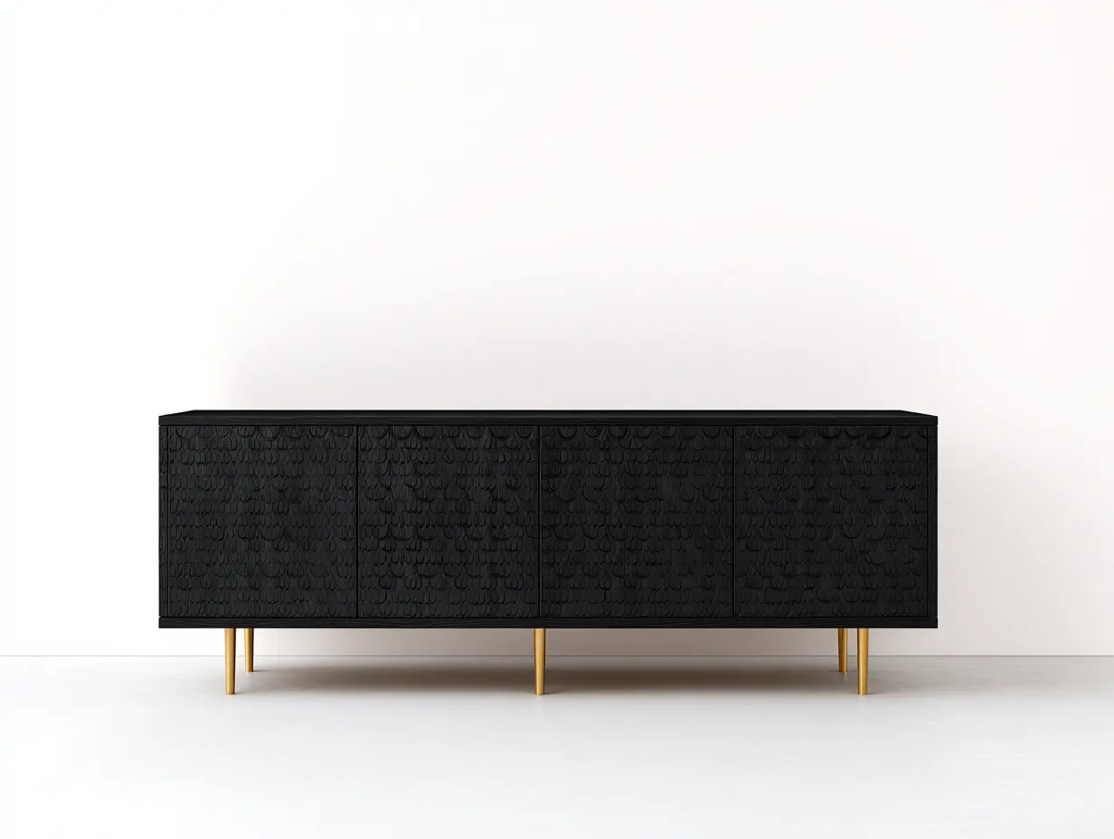 Gefertigt aus Holz und Metall. Die schwarze Oberfläche hebt die dekorative Struktur hervor und sorgt für eine gleichmäßige, stilvolle Optik. Metallfüße in Gold bieten stabilen Halt und setzen einen eleganten Kontrast zum dunklen Korpus. Die Verarbeitung ist auf den täglichen Einsatz im Wohnbereich ausgelegt und unterstützt eine langlebige Nutzung.