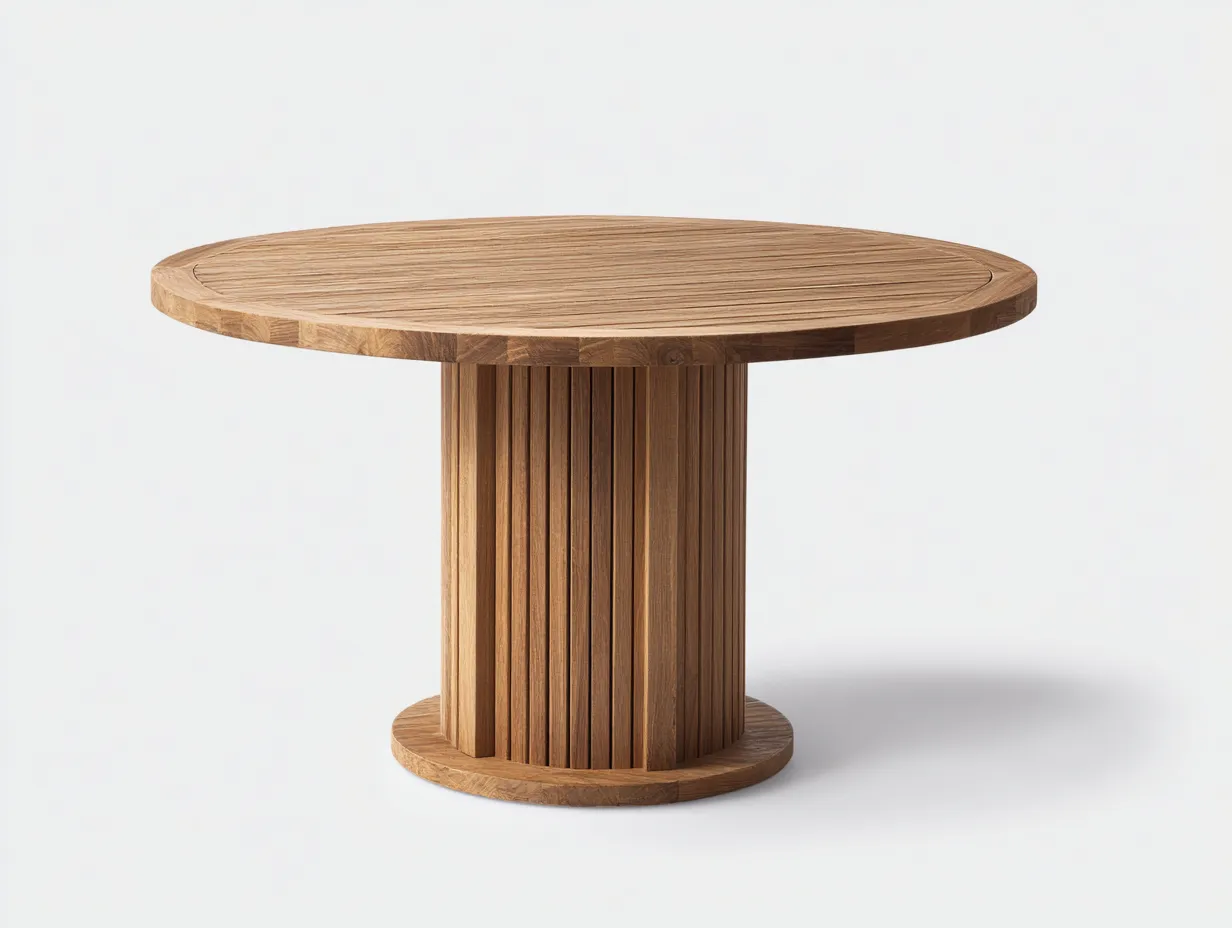 Der Gartentisch besteht aus Holz in Naturfarbe. Die Tischplatte zeigt eine sichtbare Maserung und unterstreicht die natürliche Ausstrahlung des Materials. Das stabile Untergestell mit zylindrischer Struktur sorgt für eine gleichmäßige Gewichtsverteilung und eine zuverlässige Standfestigkeit. Die Oberfläche ist sorgfältig verarbeitet und für den Einsatz im Außenbereich geeignet.